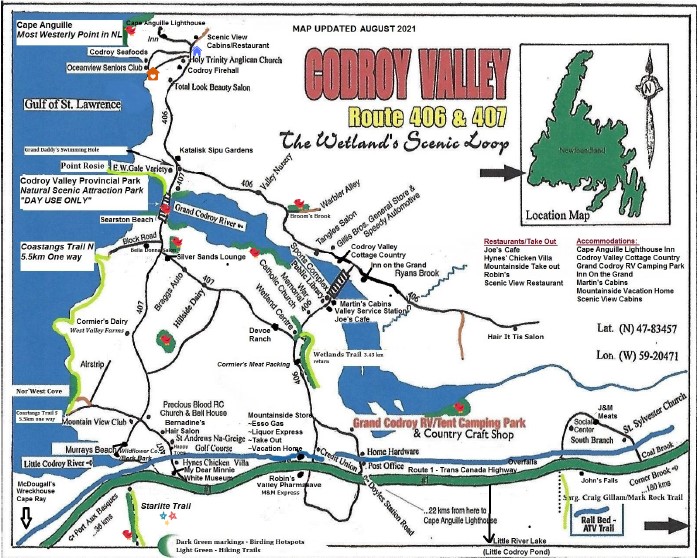 Explore View driving into Codroy. Along the shore from the Cape Anquille Lighthouse View from the Harbour of part of the town of Codroy Cape Anguille Lighthouse View of the Long Range Mountains from Codroy Harbour Historic Holy Trinity Church over-looking the ocean in Codroy Many things to do and see in the Codroy Valley. We are top left, the wee orange house with a heart.